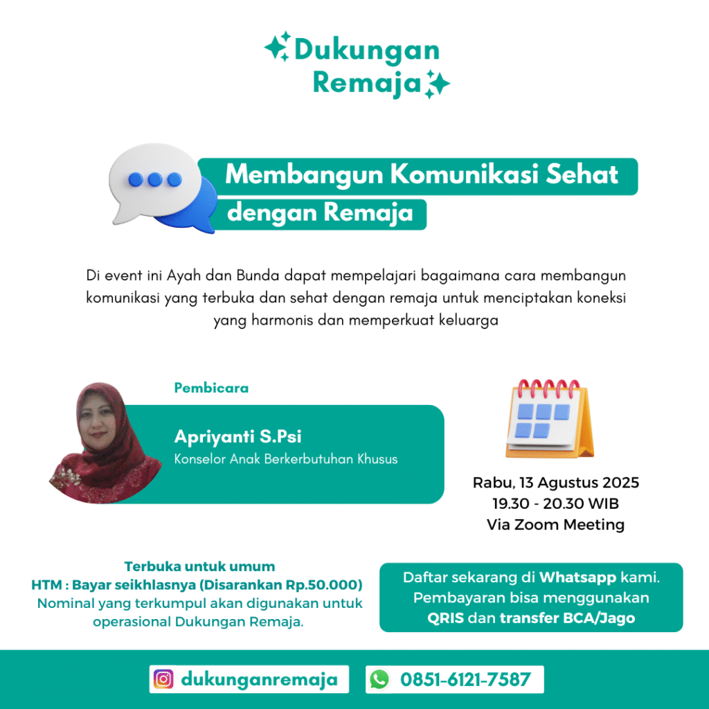 Membangun Komunikasi Sehat dengan Remaja π¬ Pelajari cara menjalin komunikasi yang terbuka dan harmonis dengan remaja, sehingga hubungan keluarga semakin kuat. π Rabu, 13 Agustus 2025 | 19.30β20.30 WIB | Via Zoom π€ Apriyanti S.Psi β Konselor Anak Berkebutuhan Khusus π° HTM seikhlasnya (Disarankan Rp50.000, untuk operasional Dukungan Remaja) π² Daftar via WhatsApp: 0851-6121-7587